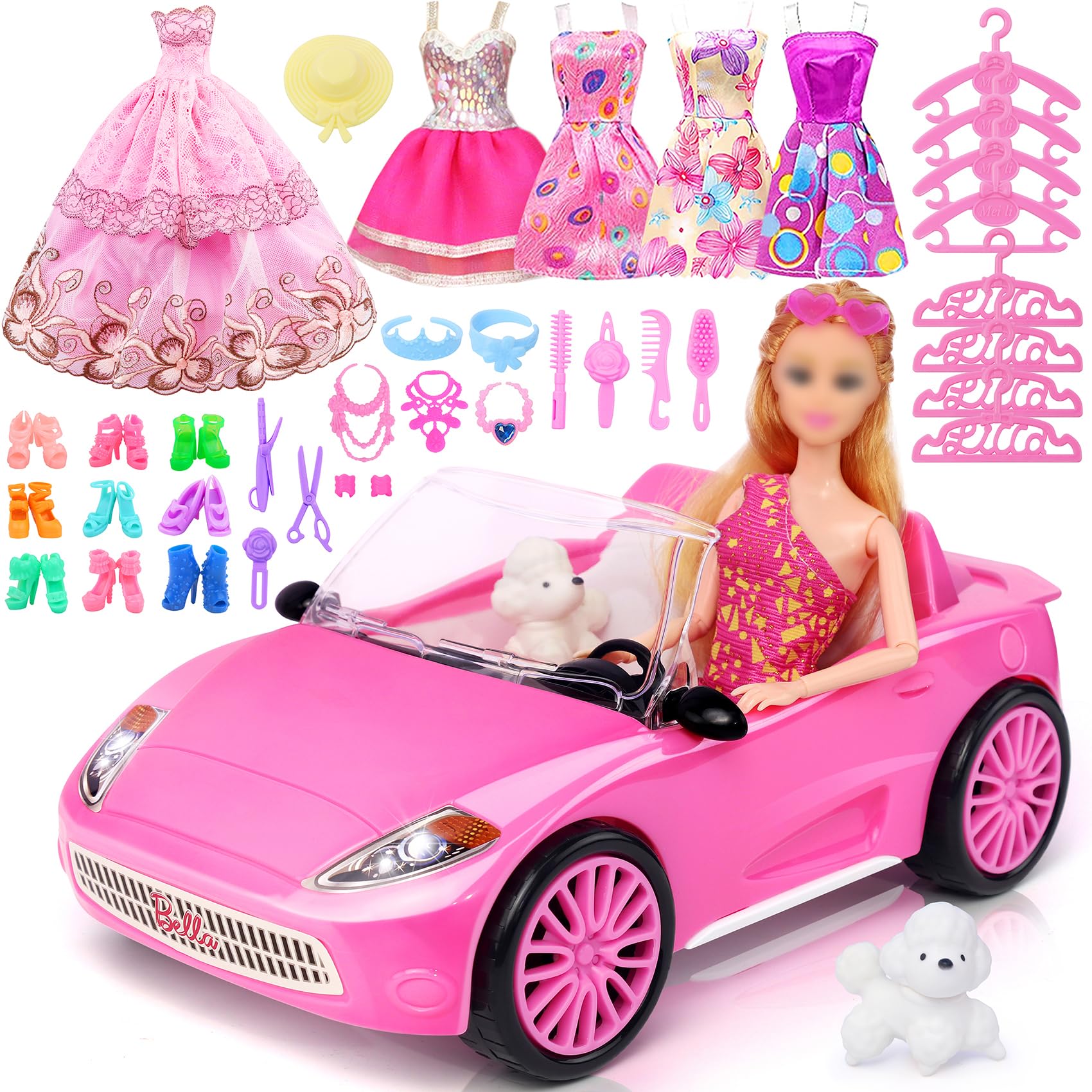 78 Pcs 11.5 Inch Doll Pink Convertible Car Playset, Dress up...