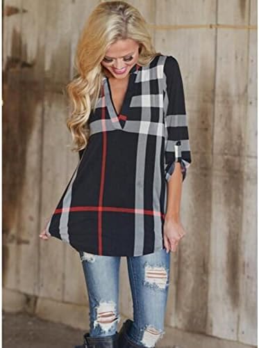 Mansy Women's Casual 2/3 Sleeve V-Neck Plaid shirts Pullover Top,Black,Large