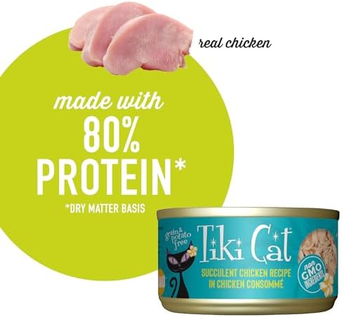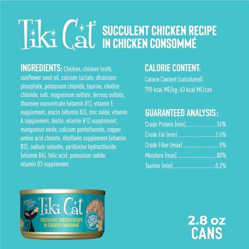 Tiki Cat Luau Shredded Meat, Succulent Chicken Recipe in Chicken Consumme, Grain-Free Balanced Nutrition Wet Canned Cat Food, For All Life Stages, 2.8 oz. Can (12 Count)