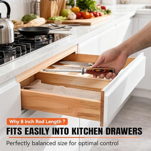 - 【STORAGE OPTIMIZED SIZE】Its optimized 8 inch length is designed for tucking neatly into most kitchen drawers or woodblock without crowding. For outdoor cooking pros, it fits in your knife roll without poking out and is versatile enough to hone most blade style.