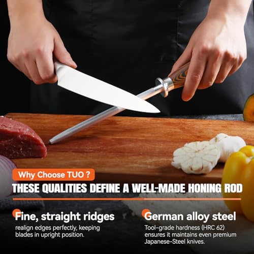 - 【SMARTER KNIFE MAINTENANCE】The TUO Honing Rod is the effortless solution for quick, daily realignment of your knife's edge, keeping it in peak ready-to-use condition. Preserves your blade's longevity with significantly less wear compared to other abrasive sharpeners.
