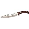 Cuchillo de caza MUELA JABALI-21E con hoja de espiga completa de 8. 375 pulgadas X50CrMoV15 (1. 4116 acero inoxidable alemán). Cuenta con un mango Coral Packwood Scale. Longitud total 13. 375 pulgadas. Viene con funda de cuero plena flor y MUELA Lifetime