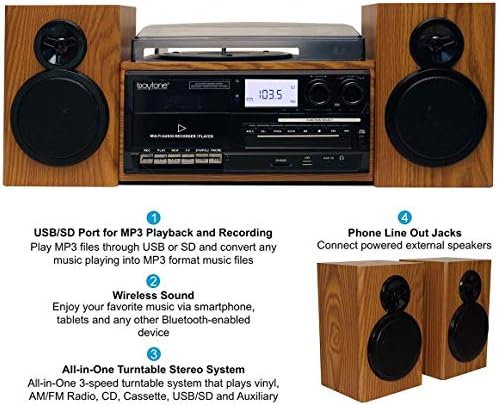 Boytone BT-28SPW Bluetooth Classic Record Player Turntable All-in-One with AM/FM Radio, CD/Cassette Player, 2 Separate Stereo Speakers, Record from Vinyl, Radio, and Cassette to MP3, SD slot, USB, AUX