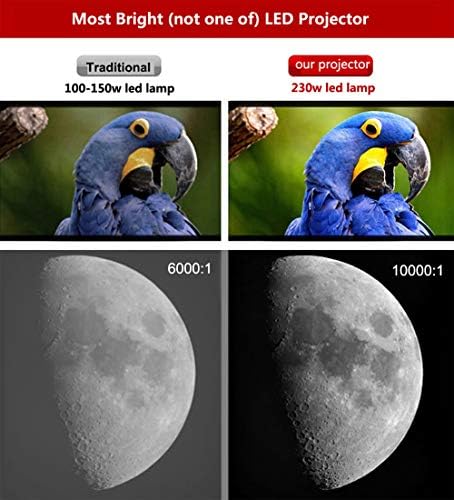 - ☸【El proyector LED más brillante】: eficiencia de utilización de la luz LED de 9500 lúmenes, más del 80% más brillante que los proyectores similares. Lámpara Cree de 230 W de alta potencia de EE. UU. (potencia máxima en el mercado). Lente de gran calibre de 6 capas en lugar de resina común para corregir las aberraciones cromáticas y de fase. lograr la alta precisión, el panel TFT de matriz de 6 «más avanzado con alta transmitancia de luz