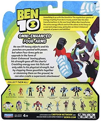 Something is up with the Omnitrix! The mysterious sparks of energy erupting from Ben's trusty watch take his alien transformations to the next level! When Ben transforms, the extra energy effects each of the aliens in his lineup in a cool and unique way, giving Ben an Omni-Enhanced upgrade of powers and abilities! Ranging in height from 4" to 5" tall, each figure in the assortment is highly detailed and articulated. Most figures also comes equipped with themed accessories for added play! This pack includes Omni-Enhanced Four Arms. He can lift heavy objects and his punches are packed with power, but when Four Arms gets an upgrade in the form of Omni-Enhanced boxing gloves, his strength goes off the charts! Crackling energy over his fists not only adds to his physical strength, but by clapping those gauntlets together or slamming them on the ground, he can also create a supersonic shockwave! BEN 10, CARTOON NETWORK, the logos, and all related characters and elements are trademarks of and © 2017 Cartoon Network.