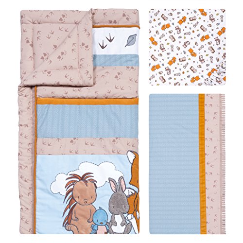Adventure awaits with Trend Lab's Wild Woods Bunch bedding collection. Adorable woodland friends will take your little one on a wonderful journey. Applique and embroidered hedgehog, bird, bunny, fox, raccoon and owl are off on a grand adventure to discover their dreams, big and small, wherever they may be found. Please adhere to JPMA's Safe Infant Bedding Practices. Set includes: Quilt, Skirt and Fitted Crib Sheet Reversible 100% cotton (exclusive of decoration) quilt measures 35 in x 45 in Flat panel crib skirt fits standard crib 28 in x 52 in with a 13-inch drop and is finished with fringe throughout the bottom Fitted 100% cotton crib sheet fits standard crib mattress 28 in x 52 in with 8-inch deep pockets and is fully elasticized Coordinates with the Wild Woods Bunch collection by Trend Lab.