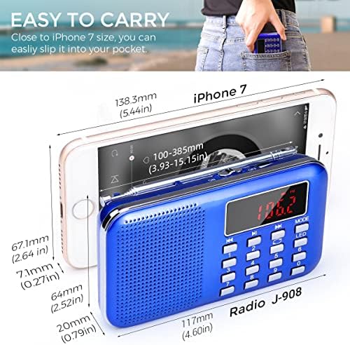 - 【PORTABLE DESIGN】 1) Easy to carry: pocket radio size (20 * 117 * 64mm), only 2CM thickness. Weight 110g, just hold the gray carrying strap, you can take the portable radio to anywhere without any burden; 2) Easy to stand: Just place the silver key (on the end of the strap) inside the jack socket, now, the small radio stand up easily! All in all, it’s a tiny buddy suitable for both indoor and outdoor use. ★KEEP AWAY FROM WATER★