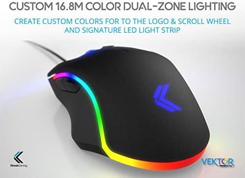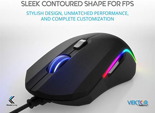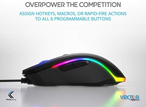 The Vektor RGB Gaming Mouse from KINESIS gaming is professional-grade eSports mouse designed to boost your performance, comfort, style, and control. performancegenuine Omron switches deliver tactile feedback Plus accuracy & durability. Use the Windows Configurator app to assign custom hotkeys, macros, or rapid-fire clicks to any of the six programmable buttons. Play with comfortthe lightweight chassis and rubber side grips let you play longer and keep you more comfortable no matter your game.stylethe Vektor features Dual-Zone, 16.8M Color RGB Lighting. Create custom color combinations using the color palette or select from one of 6 different lighting modes for a signature look.controlthe Pixar Optical sensor can be adjusted in 1 DPI increments from 50 to 5000 for the ultimate in sensitivity control. Play with domination.