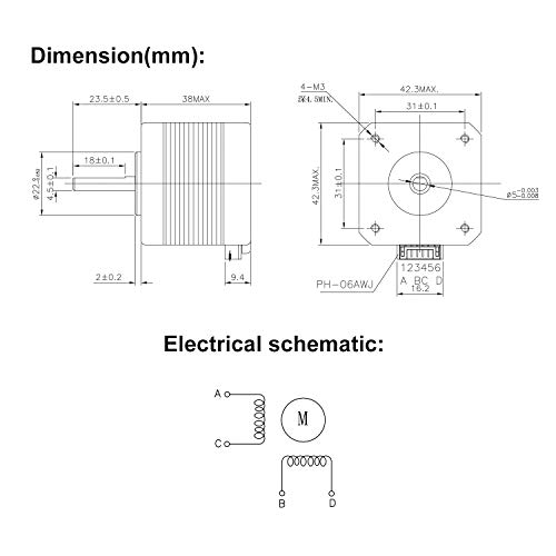 - Dimensiones: 42x42x23mm/1.65"x1.65"x0.9", ángulo de paso de 1.8 grados (200 pasos/rev), corriente nominal 1.0 A y resistencia 3.5 ohmios.