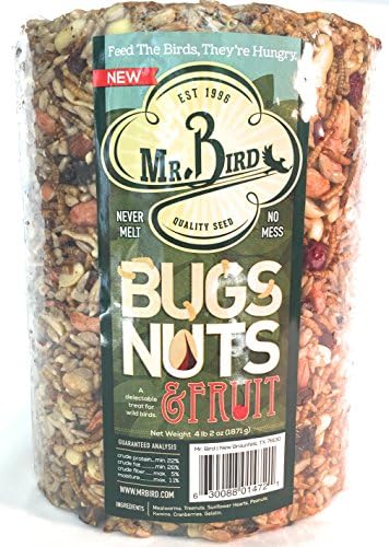 Proudly MADE IN THE USA! Bugs, Nuts & Fruit LARGE Cylinder Bugs, Nuts & Fruit A delectable feast for an amazing variety of wild birds. This formula is sure to attract your favorite feathered friends Practical & Easy to Use Easily hang with the Mr. Bird EZ Feeder. Will also work with most cylinder feeders. Long Lasting! Generous size means this cylinder will last for days and days, no more running out to refill the feeders constantly. It can't be kicked all over the place like lose seed can. Large size lasts a long time and attracts loads of birds. No waste, no mess, never melt. A Healthy Diet for your Feathered Friends An amazing variety of birds visit these Seed Cylinders! In addition to the regular feeder birds such as; Cardinalschickadeeswoodpeckersnuthatchesfinchestitmice We have reports of various warblers, wrens, kinglets, mockingbirds, and even bluebirds eating these Seed Blocks. What makes this product special is the formula; a fantastic blend of mealworms, pecans, sunflower hearts, raisins and cranberries. BUG APPETIT! You will see the quality and the dramatic results in your own yard. No Waste or Mess Quality ingredients means these seed cylinders attract birds much more quickly than suet and without the problem of melting in the summer heat. Great for year-round bird feeding