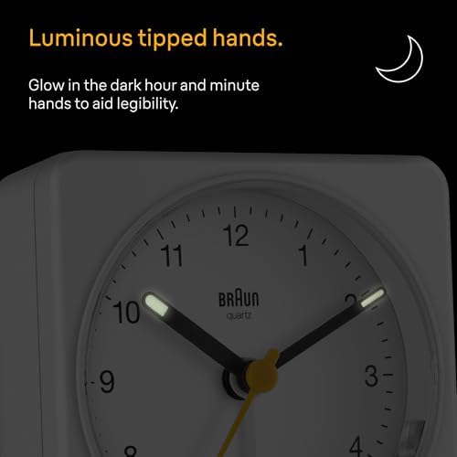 Braun Classic Analogue Alarm Clock with Snooze and Light, Quiet Quartz Sweeping Movement, Crescendo Beep Alarm in White, Model BC03W.