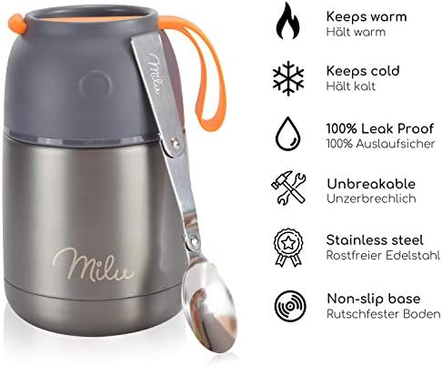 - 💧100% LEAK PROOF - The Milu Thermos Food Jar is absolutely shaking and leak-proof. The container can be carried perfectly in a backpack or in the enclosed bag.