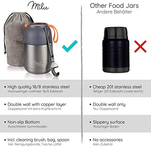 - 🛡HIGH QUALITY MATERIALS - Most Thermos Food Jars are made of cheap stainless steel 201. But not our Milu Food Container, this is made of durable and high quality 304 food stainless steel that lasts forever!