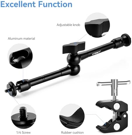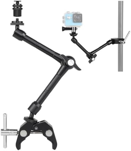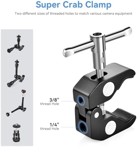 - 【Versatility and Facility】The Package comes with a super clamp with 1/4" and 3/8" threads and an articulating arm with 1/4” screws on both ends respectively. Easy Installation, No need to drill on the wall or any platform. The unique design of this set allows universal mounting options such as DSLR camera, LCD field monitor, flash light, LED video light and crossbars.