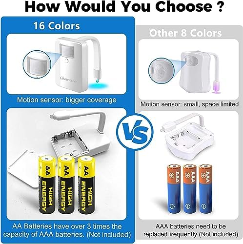 - EASY to INSTALL and CLEAN - Operated by 3 AA batteries (1.5V), which is much longer lasting than AAA items, easily get and change. (Battery not included). The flexible arm of lamp fits any shaped toilet bowl. Ultra-water resistant and can be cleaned with most household cleaners indoor, a useful bathroom essential accessory