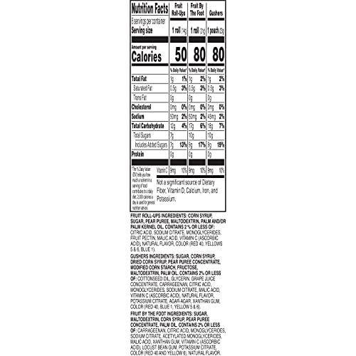 - CONTAINS: One 5.1 oz Variety Pack of Fruit Roll-Ups, Fruit by the Foot, and Gushers Fruit Flavored Snacks; 8 count