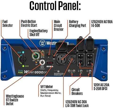 The Westinghouse WGen9500DF Dual Fuel Portable Generator produces up to 12,500 peak watts and 9,500 running watts. The WGen9500DF is a dual fuel generator that operates on gasoline or propane (LPG). The heavy duty 457cc 4-Stroke OHV Westinghouse Engine is constructed of a durable cast iron sleeve and runs for up to 12 hours on a 6.6 gallon (25 L) gas tank, keeping you powered through the day with built-in fuel gauge, automatic low oil shutdown, and GFCI outlets. Push-Button Electric Start makes starting the WGen9500DF effortless while the remote start key fob offers added ease from a distance. Its intuitive control panel spotlights the Transfer Switch Ready L14-30R 30A and larger 14-50R 50A to power your major appliances like the air conditioner, refrigerator, and sump pump as well as any lights or entertainment centers all at the same time with a single cord hookup. VFT Data Center displays volt output, frequency, and lifetime hours to keep you up to date with real-time information and regular maintenance. Conveniently portable with an included set of heavy duty never-flat wheels, handle, and lift bracket, it'll have your house, travel trailer, or jobsite powered in seconds. The WGen9500DF is complete with a 3-Year Limited Warranty and Lifetime Technical Support backed by our nationwide customer service and support network.