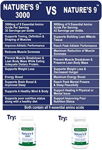 - Nature’s 9 has special ratio of essential amino acids in one supplement for optimal support of protein synthesis, growth, metabolism & for every process. Per pill. L-Leucine 165mg, L-Isoleucine 140mg, L-Methionine 115mg, L-Phenylalanine 150mg, L-Valine 140mg, L-Lysine 140mg, L-Threonine 75mg, L-Tryptophan 35mg & L-Histidine 40mg. A Vegan BCAA & EAAS amino acid complex to enhance your workouts, health & how you feel. Order right now and start helping your health & workouts today.