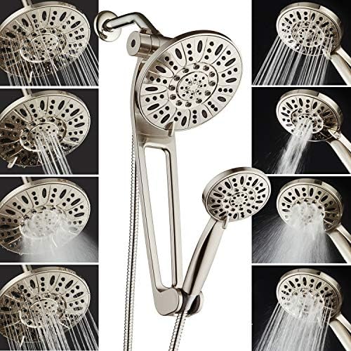 - HIGH-PRESSURE SPA LUXURY! Enjoy giant 6-setting 7" overhead showerhead and matching 6-setting hand shower separately or together! Choose from 48 pampering flow patterns including Rain, Massage, Mist, Water-saving Pause and multiple combination modes. Each shower head features advanced high-pressure 3-zone dial with anti-clog rub-clean jets for effortless cleaning. Luxurious high-power hand shower with large 4" face and premium stainless steel hose can be used as stationary or handheld shower.
