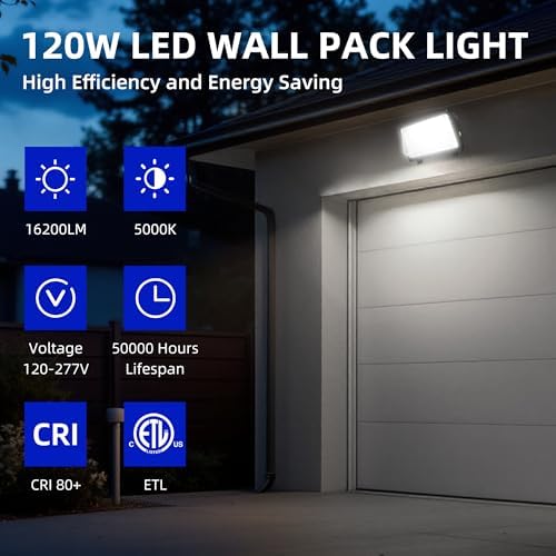 - 💡💡💡【𝐄fficient and 𝐁right】The 120W LED wall pack light blends together both effieiency and brightness.Using only 120W, this light yields 16200lm and with wide beam optics, the LED wall pack delivers the pefect illumination for outdoor security lighting, wall perimeter lighting, garages, large backyards, commercial loading bays, warehouses, apartment complexes, hotels and office and retail complexes. Suggested for mounting heights from 14-15ft.