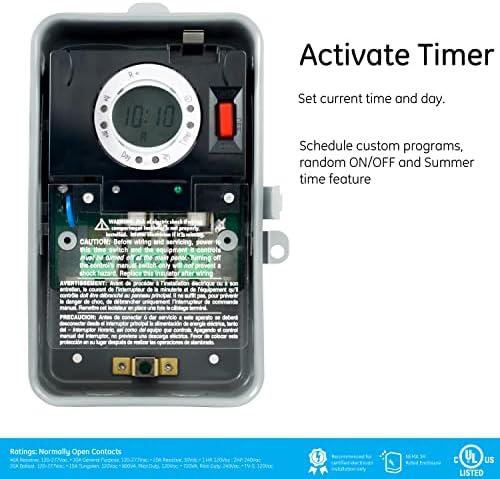 Schedule your week with a GE-branded 7-Day Digital Box Timer The heavy-duty box timer is perfect for fans pumps pool heaters AC units heating and ventilation systems and more For additional durability and security for outdoor use the weatherproof metal case is lockable tamper resistant and NEMA 3R-Rated Up to nine ON/OFF settings per day can be selected to control single-pole single-throw and double-pole single-throw switches Set current time and day and start scheduling custom programs as well as the summer time feature to personalize the 7-day cycle Convenient and secure block terminals allow fast easy wiring while auto-sensing universal voltage – 120 VAC 240 VAC or 277 VAC – detects required power to support a variety of equipment With a battery backup you will not have to worry about resetting your timer after a power outage Manage your home’s large appliances with the GE-branded 7-Day Digital Time Switch.