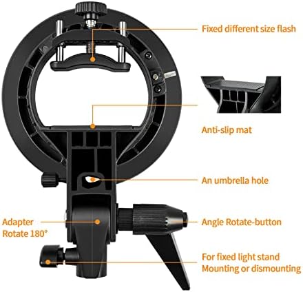 - Godox S-type speedlite bracket is superior: all-in-one, smaller size, portable design, no assembly/disassembly, and easy mounting system. Quickly add Bowens-mount lighting accessories to get creative lighting effects.
