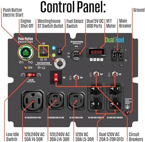 - Features Two GFCI 120V 5–20R Standard Household Receptacles, One 120V L5-30R Outlet, One Transfer Switch Ready 120V L14-30R, One RV Ready 120/240V 14–50R, and Two 5V USB Ports; All Outlets Have Rubber Covers for Added Safety