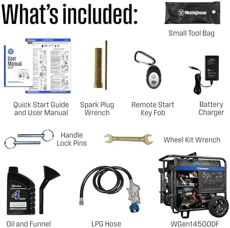 For your toughest power needs, the Westinghouse WGen14500DF Dual Fuel Portable Generator is an ultra duty generator engineered for strength. With 18,000 peak watts and 14,500 running watts, the WGen14500DF is built with a brawny 713cc V-Twin OHV Westinghouse Engine to yield up to 11 hours of run time on a 10.5 gallon (40 L) gas tank and operates on either gasoline or propane. It features Push-Button Electric Start, making starting the WGen14500DF effortless while the remote start key fob offers added ease from a distance. Transfer Switch Ready L14-30R 30A and larger 14-50R 50A outlets have the muscle to power all your major appliances like your air conditioner, refrigerator and sump pump as well as lights or entertainment centers at the same time with a single cord hookup. At less than 5% THD, the WGen14500DF allows you to safely and easily power sensitive electronics like computers, phones and TVs. Copper windings help the unit produce cleaner power, run cooler and last longer. The VFT Data Center displays real-time performance information to keep you up to date with regular maintenance. Constructed with a rugged steel frame with lift brackets, the WGen14500DF is also conveniently portable with an included set of heavy-duty never-flat wheels and handles to have your house, travel trailer, or job site powered in seconds. The WGen14500DF is complete with a 3-Year Limited Warranty and Lifetime Technical Support backed by our nationwide customer service and support network.