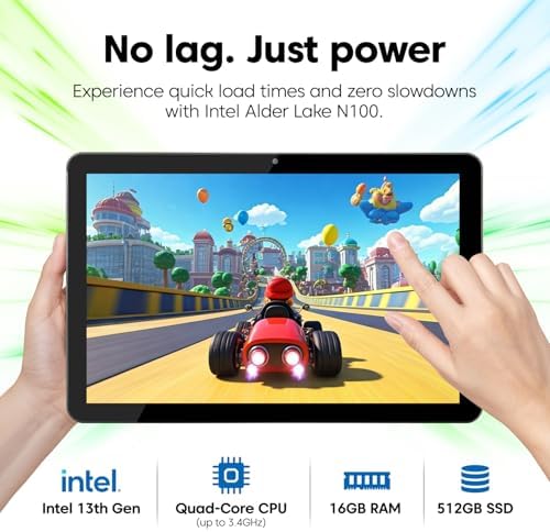 - Blazing Fast 16GB RAM & 512GB SSD: Enjoy high-speed multitasking with 16GB of RAM and lightning-fast 512GB SSD storage, plus a 512GB MicroSD card slot for more space. Open apps instantly, breeze through tasks, and store essentials without compromise on your 10 Inch Windows tablet PC.