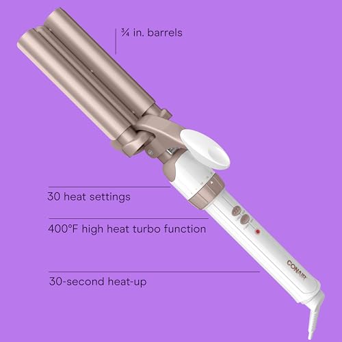 Presentamos el nuevo Waver de triple cañón de doble cerámica de Conair. Esta onduladora está diseñada para crear hermosas ondas continuas. El mayor contenido de cerámica crea un calor uniforme y permite peinados hermosos y duraderos con menos encrespamiento. Cuenta con 30 ajustes de temperatura que calientan al instante hasta 375 grados, incluido el Turbo Heat Boost para zonas difíciles de peinar; se apaga automáticamente.