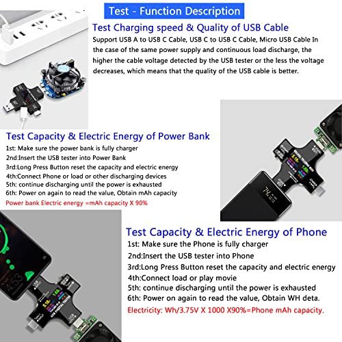 - 【Múltiples funciones de detección del comprobador USB C】El probador USB C puede monitorear el voltaje, la corriente, la potencia, la resistencia, la potencia, la capacidad, la temperatura del cable micro-USB/cable USB C/USB C/USB A, el tiempo de carga, el grupo de prueba y la carga rápida. Compruebe el rendimiento del cargador USB C/USB A y el cable USB C/USB C/cable USB C/USB C (velocidad y calidad de carga). También se puede utilizar para encontrar la corriente máxima de los cargadores inalámbricos y probar la capacidad y la potencia de los bancos de energía.