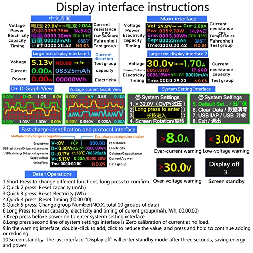 - 【Pantalla IPS a color】Proporciona 9 interfaces de pantalla a color IPS, y la interfaz de pantalla se cambia mediante botones. El probador USB puede detectar datos como voltaje, corriente, potencia, resistencia, electricidad, temperatura, capacidad, temporización, carga rápida, D/D, V/V, etc. También puede detectar si el cargador o el cable admiten una carga rápida. (La pantalla a color IPS HD es más clara. Solo la interfaz de rotación de la pantalla permite girar la pantalla 180 grados)