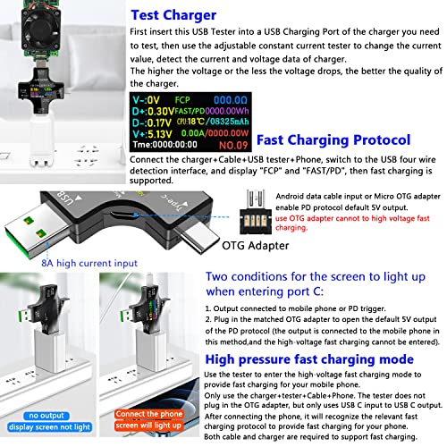 - 【Pruebe el voltaje y la corriente del cable】Soporta pruebas de cables micro-USB, cables USB A a USB C, cables USB C a USB C. Utilice un cargador de excelente calidad después de la prueba, inserte el cable, conecte la carga para probar el voltaje y la corriente del cable, si el probador El voltaje y la corriente mostrados están en línea con la corriente admitida por el cargador, la calidad del cable es excelente y la velocidad de carga es rápida; de lo contrario, la calidad del cable no es buena y la velocidad de carga es lenta.