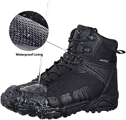 - WATERPROOF & COMFORTABLE - Waterproof coating on outer surface, well keep water from entering this mens waterproof work boots. Waterproof lycra cloth lining, well keep feet dry and breathable. Gusseted tongue prevents pebbles, sand, dirt and other debris entering this tactical boots. Durable lace and quick fasten-up, convenient waterproof hiking boots for men