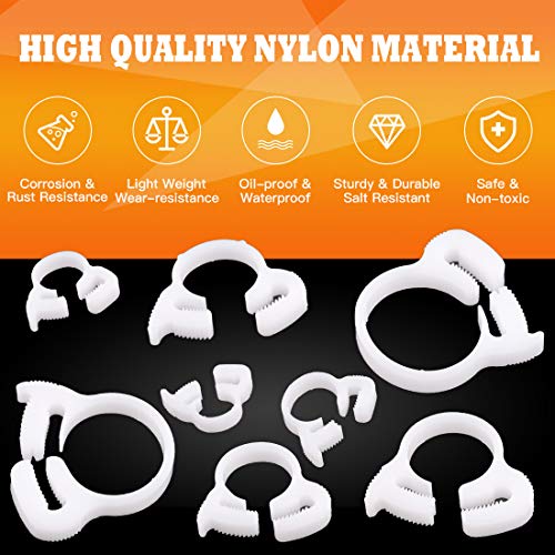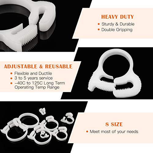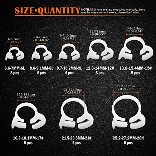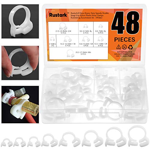 Rustark 48 Pcs Heavy Duty Double Gripping ABS Hose Clamps Assortment Kit Specifications: Color: White Clamps Range: 6.6 to 7.0mm, 8.6 to 9.1mm, 9.7 to 10.2mm, 12.3 to 14.0mm,13.8 to 15.4mm,16.3 to 18.1mm, 21.5 to 23.5mm, 25.2 to 27.2mmQuantity: 48 pcsFeature:★Adjustable:flexible and ductile. Clamp’s diameter can be adjusted according to your needs.★8 kinds of size: hose clamps assortment meets your various needs.★Not tools needed: easy to install and removal. ★ High Quality: Salt resistant, anti rust, anti-corrosion, waterproof, oil-proof. Environmental-friendly: Reusable, 3 to 5 years service time.Package Including:6.6 to 7.0mm-------------8 pcs 8.6 to 9.1mm-------------8 pcs 9.7 to 10.2mm-------------6 pcs12.3 to 14.0mm -------------6 pcs13.8 to 15.4mm-------------5 pcs16.3 to 18.1mm -------------5 pcs21.5 to 23.5mm-------------5 pcs 25.2 to 27.2mm-------------5 pcsTotally 48 Piece About Service If you have any questions about our products or any problems with your packages, please feel free to contact us.We will reply you within 12 hours and we will try our best to solve the problems until your satisfaction.