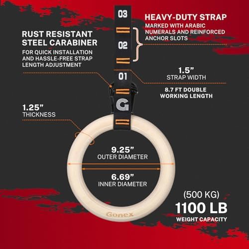 - Wood Gymnastic Ring: Gonex Gymnastic Rings is made of 1.25” THICKNESS Wooden Rings, more durable and safe than PC or ABS plastic rings, will not appear easy to break
