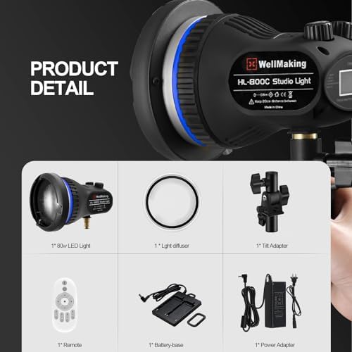 Wellmaking 80W Luz LED portátil Luz continua COB Foco Luz de video CRI 97+ Lente Fresnel liviana regulable sin ruido Fuente de alimentación AC/DC Montaje Bowens Luz portátil para fotografía