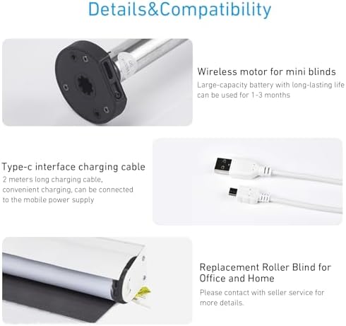 - 5V DC output, can be charged with phone charger Charging with type-c cable, build Lithium battery allowing for a completely wirefree installation of roller shades for windows