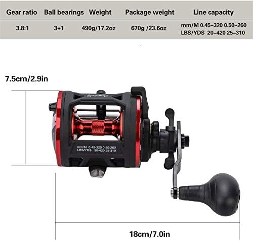 - PARÁMETROS ESPECÍFICOS -- 3+1 rodamientos de bolas de acero inoxidable, la relación de transmisión es 3.8:1. El brazo de mango de aluminio tiene una mayor resistencia, gran capacidad de línea (mm/M): 0.45-320 0.50-260, LBS/YDS: 20-420, 25-310