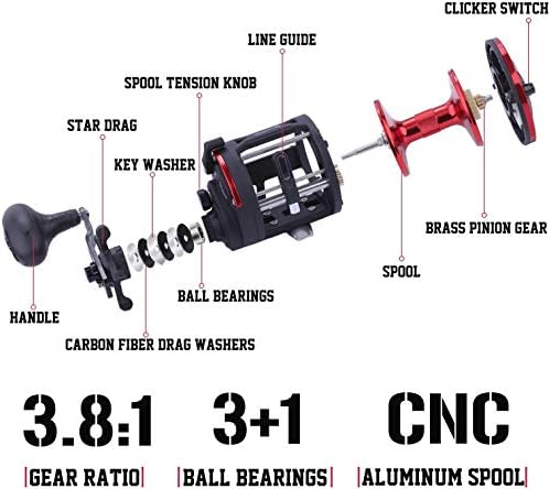 - ARRASTE POTENTE -- Los carretes de fundición redonda utilizan un suave drag de disco de carbono que ofrece 28 libras de poder de detención de peces. El carrete convencional de cebo redondo será perfecto para salmón, trucha de mar, trucha, kokanee, walleye, trucha de lago, lubina rayada, especies de agua salada o dulce y mucho más.