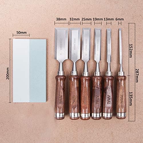 Aral 8 pcs wood chisel set, walnut handle and Vanadium steel blade, 6mm, 13mm, 19mm, 25mm, 32mm, 38mm and 2 sharpening stones, presentation in wood box