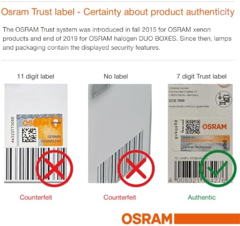 • This is a verifiable original OSRAM product and the label has: a 7-digit label code, the last 3 digits of the label code can be seen as a hologram in the lower right corner, a QR code leading to our OSRAM Trust Program website, the OSRAM logo and the URL to the Trust page are written on it, a security strip with microtext , legible with magnifying glass.