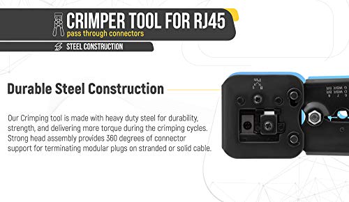 - Kit de herramienta de crimpado RJ45 Incluye - 50 piezas conectores a través de Cat6, 50 protectores de tensión de cable transparentes y cuchillas de repuesto extra