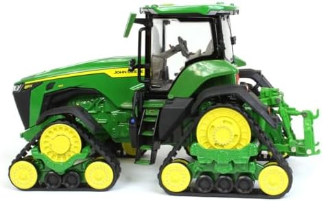 All new tooling of John Deere's, industry's first fixed-frame four-track tractor. Features include die cast body, hood, front axle, cab roof, and front and rear track frames. Additional features include clear cab windows, detailed interior, movable 3-point and pivoting cab mirrors and track frames. Age grade: 14+