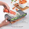 - ADIÓS A LAS ENCIMERAS SUCIAS: hemos diseñado especialmente un recipiente antideslizante para alimentos que te proporciona un agarre firme durante la preparación de las comidas. Ya no tendrás que preocuparte de que las rebanadas se caigan por todas partes y hagan un gran lío. Recomendamos encarecidamente utilizar el soporte de seguridad para alimentos al cortar en lonchas, especialmente para verduras, frutas o quesos más pequeños.