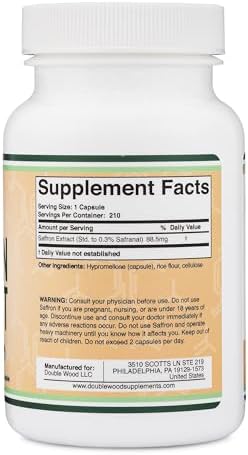 Suplemento de azafrán para concentrarse: cápsulas veganas de 88,5 mg de extracto de azafrán (210 unidades), un pequeño supresor del apetito para un control saludable del peso (apoya la salud de los ojos, la retina y los lentes) de Double Wood