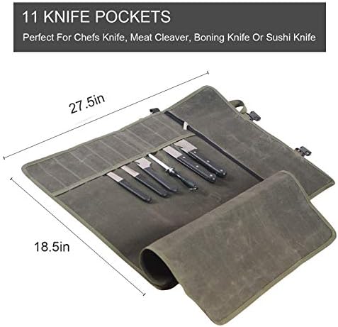 - 11 SLOTS KNIFE POUCH HOLDERS - 27.5" Wide X 18.5" Can Holds Kitchen Knife Tools Up To 18.8” , Including 10 Slots Plus 1 Zipper Pockets, And Form A Tight Roll When Wrapped.