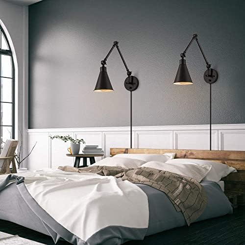CADUKE Swing Arm Wall Lamp for Bedroom, Set of 2 Plug in Wall Light Fixture with Dimmable Switch, Industrial Metal Black Wall Reading Sconce for Living Room Farmhouse Hallway