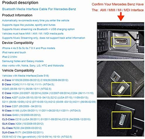 CHELINK Car Bluetooth 5.0 Audio Adapter for Mercedes Benz It designed for integrating wireless bluetooth music streaming with the original AMI MMI integration kit found in the glovebox. Simply plug into your cars existing Phone/Media socket. Automatic reconnection every time when you enter the vehicle. Let the Fun Begin! Listen to content from your Bluetooth capable device over your car's stereo system using the Bluetooth adapter.Works with any Apple, Android or any other Bluetooth capable device including iPhone xs and Samsung Galaxy 9. Compatible Listing Suitable for Mercedes Benz have AMI interface model Such as: Mercedes Benz SL S GLK A B C G GLE GL R E CLS A B C G GLE SLS AMG-Class MY2011-2015. MB models with Comand APS NTG 4.5. Optional code is 518. Please refer car model/ radio/ year on below description before purchase: E-Class S212 (04/2013-09/2016) C-Class W204 (03/11- 02/14) S204 (03/11-08/14) W212 (04/2013-03/2016) A207 (03/2010-04/2013) C207 (05/2009-04/2013) NOTE: 1.Depending on production date and the specific configuration of the car. The original box of AMI must has been preinstalled or installed in original audio host, and which is usually installed in the copilot's glove box or center armrest box, please check the configure list of your car or the car getting ready to be assembled before you purchase 2.It does not support skip and control music playback using original steering wheel. 3.It does not support read and display your entire i-Pod library from your devices on your car display.