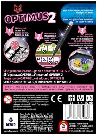Diseñador: Wolfgang Warsch Arte: Leon Schiffer Después de Optimus, que ahora se considera el mejor juego Roll & Write en el mercado, llega... ¡Optimus 2! Una nueva oportunidad para poner a prueba tu conocimiento y convertirte en el mejor "optimizador" en la mesa. ¡Nuevos paneles! ¡Nuevas datos! ¡Nuevas combinaciones! ¡Nuevas habilidades! ¡Nuevos caminos hacia la victoria! ¿Harás combinaciones complejas con los dados plateados o tratarás de obtener la mayor cantidad de iconos de zorro? ¡Juega con tus amigos o supera este nuevo desafío por ti mismo!
